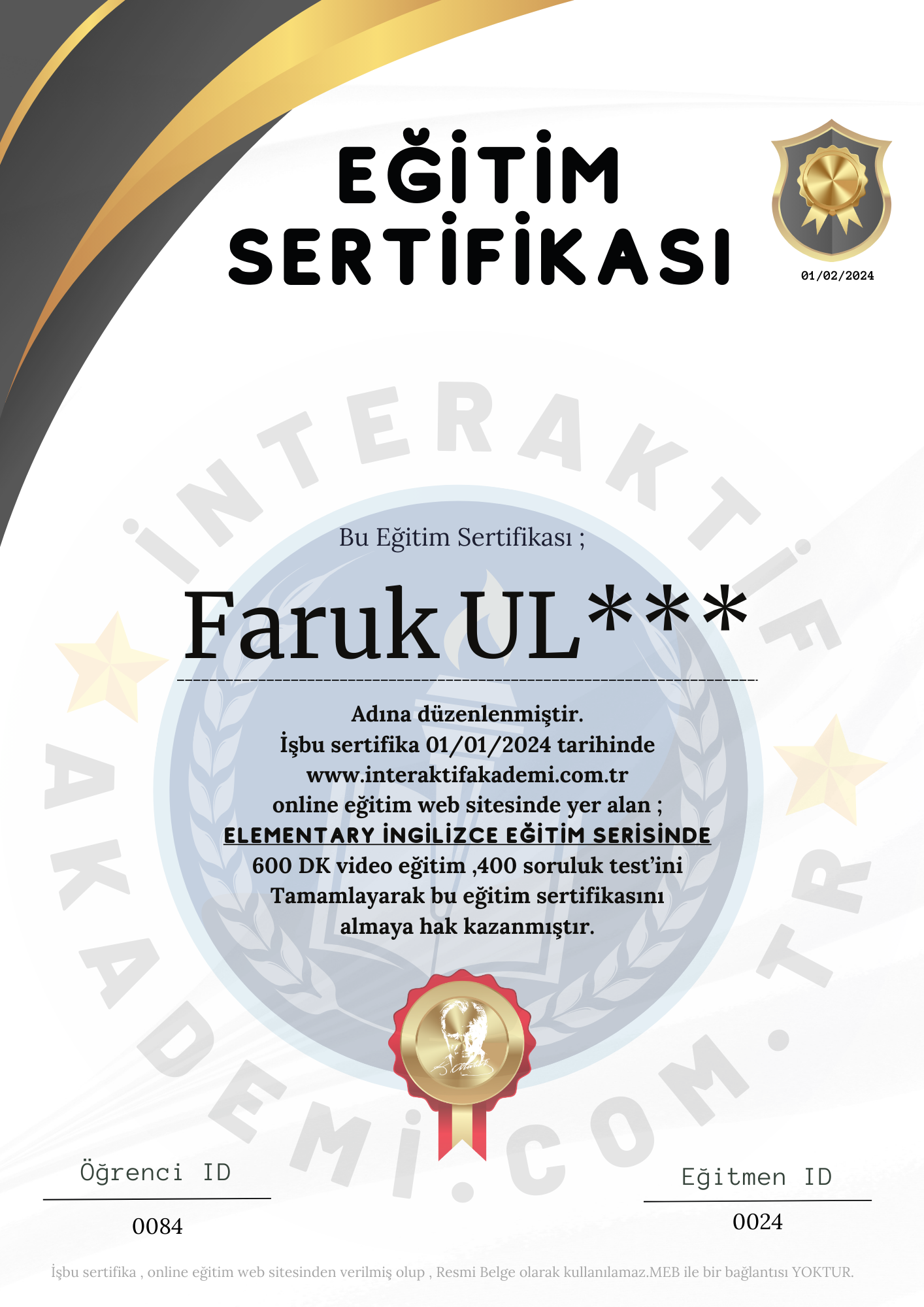 Almış / Tamamladığınız eğitim sonrasında , MEB ile bağlantısı olmayan , ANCAK interaktifakademi.com.tr ve ğitimini aldığınız eğitimcinin bilgileri ile , tarafınzıa , EĞİTİM TAMAMLAMA / KURTSİYER sertifikası sunuyoruz. Hiçbir resmi geçerliliği olmayan bu sertifika ile , iş başvurularında , eğitim referansı olarak kullanabilir , ve/veya aktif çalışıyor olduğunuz işletmede terfi almanızda önemli rol oynacak şekilde dile getirebilirsiniz.